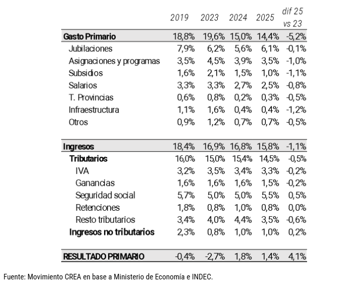 Incluso, la baja del ritmo inflacionario tiende a propiciar una recuperación en el haber jubilatorio y, por lo tanto, en las erogaciones. Por otra parte, las transferencias discrecionales a provincias suelen ser una variable de negociación en años de intensa actividad en el Congreso por lo que, con la reforma tributaria y laboral en el horizonte, es esperable que el Gobierno deba ceder y aumentar esas partidas que hoy son menos de la mitad de los niveles de, por ejemplo, 2017. Algo similar ocurre con la obra pública, hoy en niveles históricamente bajos, solo 0,4% del PBI, que evidentemente no pueden mantenerse indefinidamente. Así, en el margen el Gobierno va a tener un panorama menos holgado del lado del gasto.