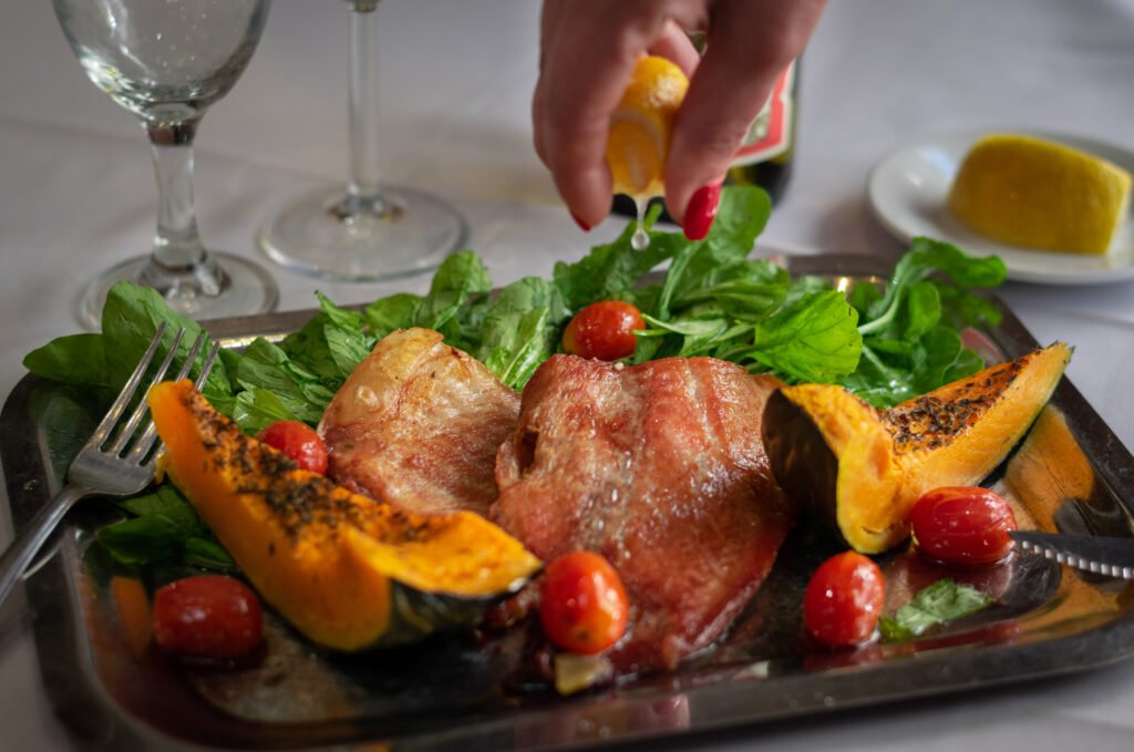 calabaza sobre la base del plato y a un costado el pacú y sumar la ensalada.