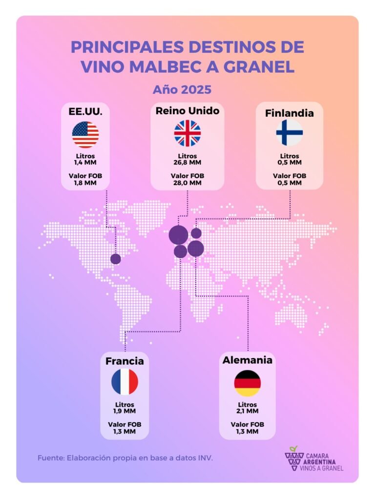 En términos de mercados, el Malbec a granel argentino mantiene una fuerte dependencia del Reino Unido, que en 2025 concentró el 77,1% de los envíos (26,8 millones de litros). Le siguen, a considerable distancia, Alemania (5,9%), Francia (5,4%), Estados Unidos (3,9%) y Finlandia (1,5%). En total, el varietal llegó a 20 destinos, incorporando nuevos mercados como Hungría, Colombia y Chile.