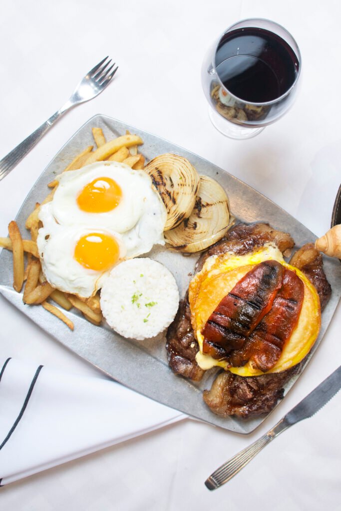 Uno de los platos más pedidos por los extranjeros es el clásico “Bife Malevo”, es un bife de chorizo con morrón a la parrilla, huevo frito, papas fritas y una provoleta bien dorada.