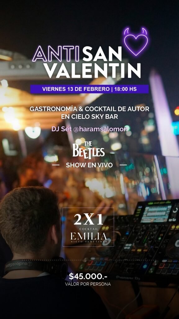 Por su parte, Cielo Sky Bar, ubicado en el piso 13 del hotel, propone dos experiencias diferentes para celebrar el amor desde miradas complementarias. El viernes 13, abrirá las puertas para celebrar el Anti San Valentín con una experiencia distinta desde lo más alto, con las mejores vistas de la ciudad. A partir de las 18 hs, se ofrecerá una propuesta de alta gastronomía y 2×1 en cócteles Emilia. El espacio continuará la celebración con DJ SET y show en vivo de The Beetles, la banda tributo que con más de 14 años de trayectoria, utilizan instrumentos originales y vestuarios de época para repasar los éxitos de los “cuatro de Liverpool”, presentándose con frecuencia en teatros y festivales de Argentina y Latinoamérica . El valor de la tarjeta en Cielo Sky Bar es de $45.000 por persona.