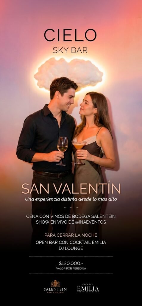 El sábado 14, Cielo Sky Bar presenta “Velada Bajo las Estrellas”, una propuesta pensada para quienes buscan una celebración más íntima. La experiencia comenzará a las 20 hs con una cena de tres pasos con maridaje de vinos bodega Salentein, acompañada por un show de cuerdas en vivo, y continuará desde las 22 hs con Open Bar con cócteles Emilia y DJ lounge. El valor de la experiencia es de $120.000 por persona.