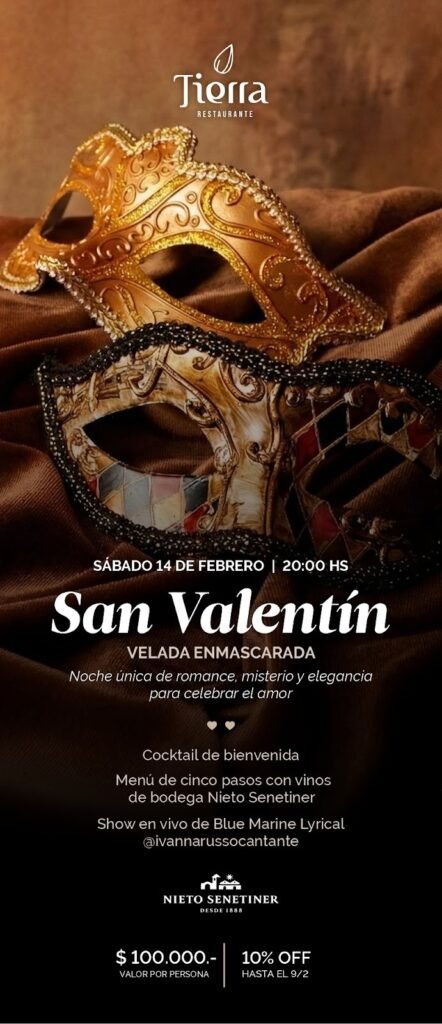 La velada se completa con un show de gala lírico en vivo a cargo de Blue Marine Lyrical, que tendrá como protagonista a la soprano Ivanna Russo, acercando la magia de la ópera a los comensales. La ambientación y el concepto enmascarado aportan un diferencial que transforma la cena en una experiencia inolvidable, donde el romance, el misterio y la elegancia se unen para celebrar el amor. El valor de la cena en Tierra Restaurante es de $100.000 por persona, con un 10% de descuento para quienes realicen su reserva antes del 9 de febrero.