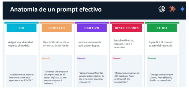 Una vez cumplida esa instancia, llega el momento de confeccionar un “prompt”, término que comprende una instrucción destinada a una aplicación de IA para obtener un resultado específico. Un prompt efectivo debe contar con cinco ítems: rol, contexto, objetivo, formato (restricciones) y resultado deseado (salida).