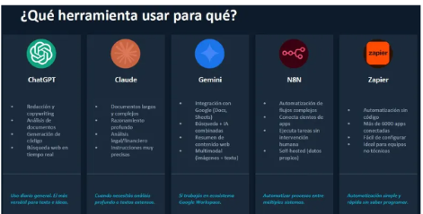 Las diferentes aplicaciones de IA disponibles, –ChatGPT, Gemini, Claude, N8N y Zapier– tienen factores en común, pero también capacidades específicas que pueden ser más útiles en uno que en otro caso dependiendo de la naturaleza y la complejidad de la tarea por realizar.